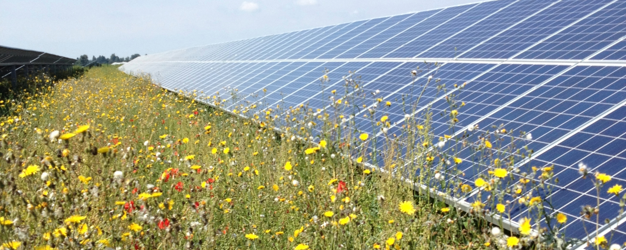 Solar panels angled over a field of wildflowers, emphasizing agrivoltaics and biodiversity planting at the array.