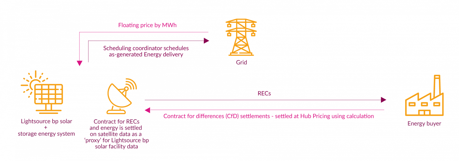 The primary difference between a proxy generation PPA and a typical virtual PPA is that the proxy generation PPA settles based on the proxy generation rather than the actual output of the project. As with a VPPA, a pgPPA is often referred to as a ‘contract for differences’ as it is a financial contract where the buyer does not physically receive the electricity. The buyer agrees to purchase a solar plus energy storage project’s output and associated Renewable Energy Credits (RECs) at a set fixed price. Lightsource bp settles based on the comparison of market price and the contract’s strike price. When the market price is greater than the fixed pgPPA price, Lightsource bp passes the upside to the energy buyer. When the market price is less than the fixed pgPPA price, buyer must true up or pay Lightsource bp the difference.