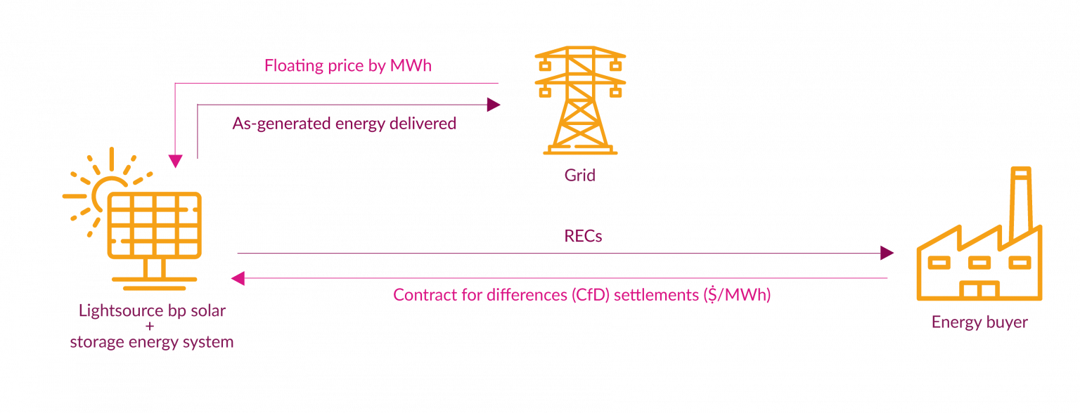 In a VPPA, Lightsource bp and the energy buyer agree to a “strike price” that Lightsource bp will receive for its delivery of electricity generated and sold into the wholesale market. Thereafter, any difference between the strike price and wholesale market price is exchanged between the two parties, such that the Lightsource bp in net always receives the strike price for its sales of electricity. The renewable energy certificates (RECs) generated by the solar project are typically contractually conveyed to the energy buyer in the Financial PPA. The RECs entitle the buyer to exclusive rights to make claims about using the green power produced by the solar project and the associated reductions in scope 2 emissions. No electricity, however, is physically conveyed from the generator to the buyer.